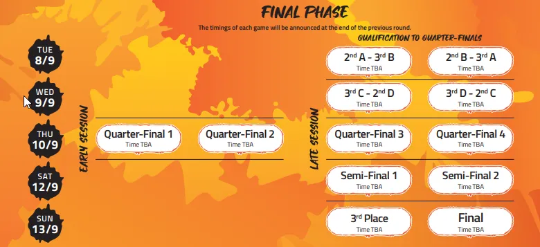 | Qualification to Quarterfinals | Sept 9–10 | Cross-group play-ins for Quarterfinal spots |